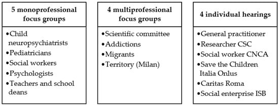 The Scientific Committee (one Chair, the Chair and an elected councilor of the National Council of the Order of Social Workers, the Chair and a representative of the National Council Order psychologists, the Chair of the Italian Society of Pediatrics, the Vice-President of the Italian Society of Child and Adolescent Neuropsychiatry, and three experts in the field of child and adolescent mental health) was asked to indicate experts pertaining to the professional field according to the following criteria: (1) professionals from the north, central, south, and island areas of Italy; (2) professionals dealing with minors of different ages; (3) professionals working in different delivery settings such as emergency departments, hospitals, social services, territorial services, counseling, and child and adolescent neuropsychiatry. Professionals selected from the field of child and adolescence neuropsychiatrists/psychiatrists, psychologists, and social workers included those with specific experience and roles in the following areas: disabilities, addictions, eating disorders, migrants/foreigners, and other frailties. Professionals from rural and urban settings were selected. Monoprofessional focus groups involved experts from the same professional background, albeit from different parts of the country and different organizational settings. Multiprofessional focus groups involved heterogeneous professionals who shared a particular characteristic in working with children and youth (e.g., addictions, migrants/foreigners). The following interviews were conducted between August 2021 and February 2022: (1) five monoprofessional focus groups involving, separately, child and adolescent neuropsychiatrists, pediatricians, social workers, psychologists, teachers, and school leaders; (2) four multiprofessional focus groups: one focused on the topic of pathological addictions; another delved into the impact of the pandemic on unaccompanied foreign minors; a third, having territorial characteristics, involved professionals who work in contact with underage persons in the Milan area (because of the complexity of the large metropolitan context in the pandemic era); and a fourth involved the members of the Scientific Committee. Each focus group generally included between 8 and 15 professionals; (3) six individual hearings, directed at specific professionals or private social organizations: a general practitioner, a researcher from the Codici Social Cooperative (Cooperativa Sociale Codici, CSC), a social worker from the National Coordination of Shelter Communities (Coordinamento Nazionale Comunità di Accoglienza, CNCA), a representative from Save the Children Italia Onlus, a representative from Caritas Roma, and a representative from Social Enterprise with Children (Impresa Sociale con i Bambini, ISB). The selection of monoprofessional and multiprofessional groups, along with individual hearings, involves professionals responsible for working with minors. Monoprofessional groups focus on specific issues, allowing experts to contribute their unique perspectives. Multiprofessional groups promote collaboration and a holistic approach. Individual hearings enable professionals to share firsthand experiences and provide personalized insights from their professional point of view. A total of 97 Italian professionals (age range 30 to 50 years old, 66% females) from a variety of disciplines were involved. Figure 1 is a summary of the focus groups and individual hearings held.