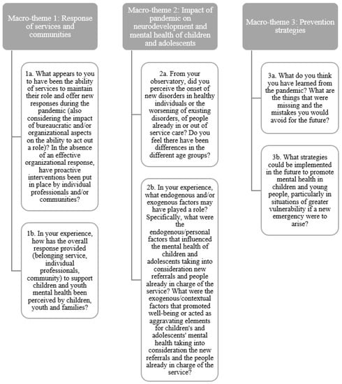 The dual-moderator focus groups were conducted with a low level of directivity to achieve authentic interaction and exchange among members. The moderators proposed three discussion themes to the groups (Figure 2), asking the participants to address them with the four phases of the pandemic in mind: phase 1, coinciding with the total lockdown (in Italy from February 2020 to June 2020); phase 2, referring to the summer of 2020 when several activities had reopened; phase 3, referring to the second wave of SARS-CoV-2 pandemic (in Italy, from September to December 2020); and, finally, phase 4, between January and November 2021 (the time when the first phase of the survey was conducted, which corresponded to the period of the gradual reopening of activities). After the introduction and reading of the themes, the interventions were spontaneous, and the moderator intervened only to lead back to the focus topic and ensure maximum participation of each member. One moderator was in charge of asking the questions and the other to make sure the questions were answered. Taking into account the purpose of the focus groups, specific areas of discussion were identified: (1) perceptions of the onset of new disorders in healthy individuals or worsening of existing disorders; (2) role played by various exogenous and endogenous factors as elements of vulnerability: age, geography, socioeconomic conditions, social isolation, presence of neurodevelopmental or psychiatric disorders; (3) perceptions of factors supporting the resilience of children and families; (4) role of the service network and community. These items were summarized into three macro-themes proposed for discussion by focus participants: (1) service and community response; (2) impact of the pandemic on the neurodevelopment and mental health of children and young people; and (3) prevention strategies. Figure 2 shows the questions posed in relation to the three macro-themes identified.