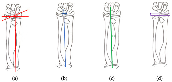 Figure 1. Radiological measurements: (a) radial articular angle, (b) carpal slip, (c) radial bowing and (d) relative ulnar shortening. - the carpal slip (Figure 1b),