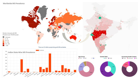 According to the data, the global population of people with MS has risen from 2.3 million in 2013 to 2.8 million in 2020 and 2.9 million in 2023. It emphasizes the numerous challenges and disparities that people with MS experience while seeking a diagnosis, treatment, or care [41]. According to the Multiple Sclerosis Society of India (MSSI) Indian Map of MS, the prevalence rate is 11 people per one hundred thousand. In India, the highest prevalence rate is in the states of Maharashtra and Delhi. The majority of people suffering from MS are females in the age range of 19–45. The private health centers of India have higher access to MS patients to diagnose and treat them than the government centers [42] (Figure 1).