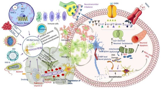 The diagram illustrates that MS is related to a neurotransmitter imbalance, which results in increased glutamate, an excitotoxic neurotransmitter, and decreased serotonin, acetylcholine, dopamine, and GABA levels. Glutamate elevation and GABA inhibition exacerbate calcium excess, resulting in neuronal excitotoxicity and mitochondrial cell failure. The increasing concentration of ROS and NO causes additional DNA damage and neuronal death, eventually altering myelin sheath development. Infections, vitamin D deficiency, smoking, toxic chemicals and foods, gliotoxins (ethidium bromide, lysolecithin, calcium ionophores, sixaminonicotinamides), genetic 6p21, viruses (EBV, HHV-6), and bacteria (borrelia buradoferi) are all environmental factors that contribute to the onset and progression of MS. While vitamin D deficiency is thought to have an effect on the immune system and increase the risk of developing autoimmune diseases, infections can trigger an immune response and cause inflammation. Smoking also enhances inflammation and oxidative stress, which may exacerbate MS symptoms. To summarize, MS is a complex disorder caused by inherited and environmental elements. These elements can cause immune system failure, oxidative stress, and neurotransmitter abnormalities, all of which contribute to the start and progression of the condition. These essential components cause the release of inflammatory cytokines such as IL-1β, IFN-, IL-23, IL-6, iNOS, MCP-1, and TNFα-2, eventually leading to an attack on neuronal oligodendrocyte cells and the breakdown of the myelin sheath.