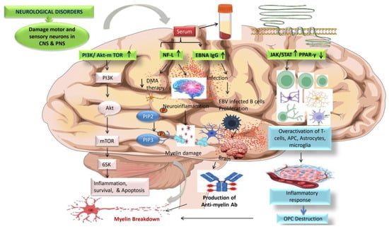 A virus may have produced immune-mediated demyelination in the brain and spinal cord [46]. The EBV is the top suspect among the probable causal agents. This human herpes virus remains dormant in B cells for the host’s life after infection [47]. The increased incidence of MS after infectious mononucleosis suggests that EBV has an underlying causal role [48]. Since the virus is not always present in MS lesions, identifying the precise mechanisms by which it contributes to the onset of MS remains challenging [49].