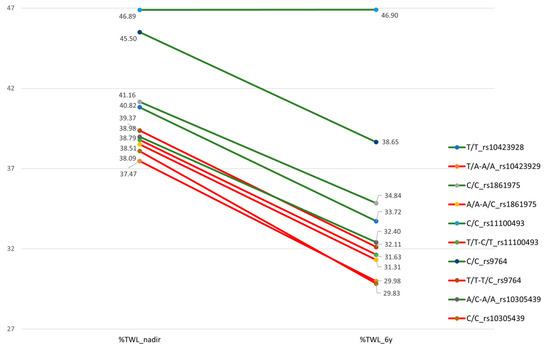| Gene | SNP | %TWL_nadir | %TWL_6y | %WR_MWL | Risk Allele |