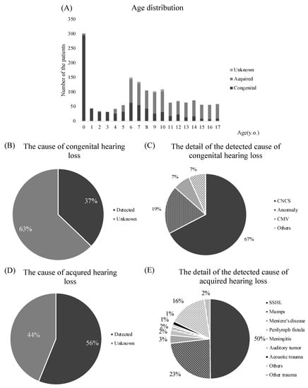 Fifty-six percent of the causes were detectable in pediatric cases of acquired hearing loss (Figure 1D), and sudden sensorineural hearing loss (SSHL) was the most common cause, followed by mumps and Ménière’s disease (Figure 1E).