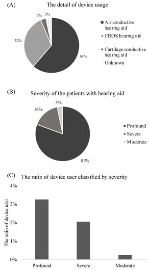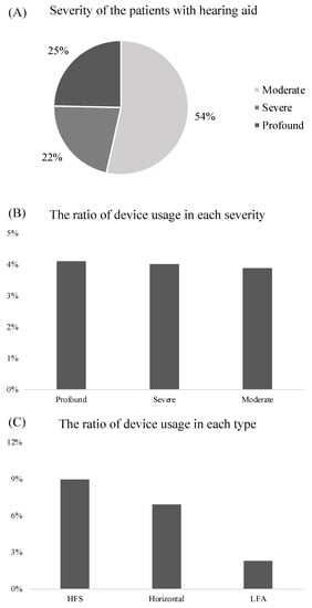 A hearing device (air conductive hearing aid, CROS hearing aid, bone conductive hearing aid, cartilage hearing aid, bone anchored hearing aid, or CI) was used in 581 patients (4.0%), in which most (n = 573, 98.6%) used a hearing aid (air conductive hearing aid: n = 534, 91.9%; CROS hearing aid: n = 26, 4.5%; bone conductive hearing aid: n = 2, 0.3%; or cartilage hearing aid: n = 1, 0.2%). Moderate hearing loss was predominant (n = 308, 54%) among hearing aid users, followed by profound (n = 142, 25%) and severe (n = 126, 22%) hearing loss (Figure 4A), but there was no clear trend in the proportion of devices usage among the type of severity (Figure 4B). The ratio of hearing aid use in HFS, horizontal, and LFA hearing loss was 9.0% (n = 63), 6.9% (n = 113), and 2.3% (n = 4), respectively (Figure 4C). Patients with HFS hearing loss tended to use hearing aids more frequently than patients with LFA hearing loss.