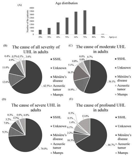 Age distribution of adults with unilateral hearing loss (A) and the causes of UHL for each severity (B–E). SSHL, sudden sensorineural hearing loss; UHL, unilateral hearing loss; y.o., years old.