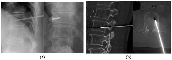 - Ravikanth, R. Diagnostic Yield and Technical Aspects of Fluoroscopy-Guided Percutaneous Transpedicular Biopsy of the Spine: A Single-Center Retrospective Analysis of Outcomes and Review of the Literature. J. Craniovertebr Junction Spine 2020, 11, 93–98. [Google Scholar] [CrossRef] [PubMed]