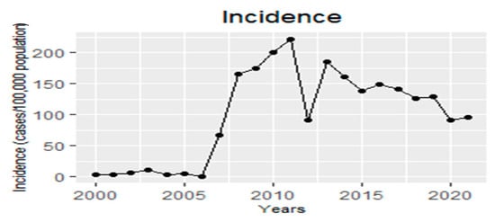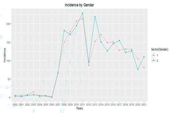 An additional classification according to gender groups was conducted for the pre- and post-vaccination periods. Female subjects were more affected than male subjects between 2000 and 2007, with an average of 78.03 HZ cases per 100,000 population per year versus 44.87 HZ cases per 100,000 population per year among male subjects. In contrast, both female and male subjects were almost identically affected between 2008 and 2021, with an average of 238.33 HZ cases per 100,000 population per year among female subjects versus an average of 239.244 HZ cases per 100,000 population per year among male subjects (Figure 3).