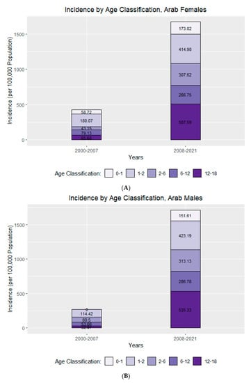 Upon comparing both sectors and several age groups, we found that the increase in HZ incidence per 100,000 population among children (both male and female) was greater in the Arab sector. The growth in the Arab female group was significantly higher compared to other groups of all ages (an average incident rate increase of 41.05 times for the Arab female subjects, 7.45 for the Arab male subjects, 3.38 for the Jewish female subjects, and 4.19 for the Jewish males subjects).