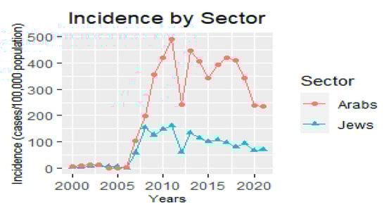 Another subdivision of HZ cases was created according to ethnic sector (Jews and Arabs). We found that, until 2007, the number of HZ cases was similar in the two ethnic sectors (an average rate of 10.1 cases per 100,000 population for the Jewish sector and 26.98 cases per 100,000 population for the Arab sector). However, from 2008, a significant increase in the number of HZ cases was observed in the Arab sector, while a less dominant increase was observed in the Jewish sector (an average rate of 96.56 cases per 100,000 population for the Jewish sector and 255.24 cases per 100,000 population for the Arab sector; Figure 4).