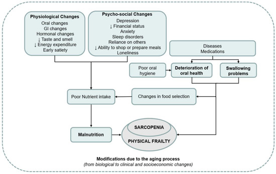 Overview of the associations between weak oral health, malnutrition, and sarcopenia, used with permission [79].