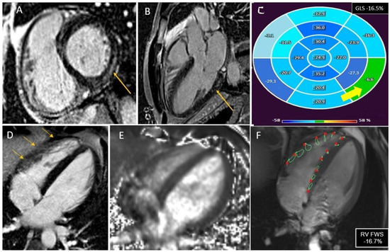 CMR assessment in a 34-year-old patient with IL-MY showing the presence of subepicardial scar in the inferolateral wall that can be seen in LGE sequence in basal short axis view (Panel (A), yellow arrow) and 3-chamber view (Panel (B), yellow arrow). Patient was also diagnosed with pericarditis involving the diaphragmatic layer of the pericardium (green arrow) with mild pericardial effusion (blue stars). The LV GLS is −16.5%, reduced in comparison to normal values, especially in the presence of myocardial scar (Panel (C), yellow arrow). No necrosis/scar was detected in LGE sequences in the RV (Panel (D), yellow arrow), and no edema was evident in T2 mapping, despite thin wall thickness limiting the diagnosis (Panel (E)). On the contrary, RV FWS was reduced (−16.7%) compared to normal values, highlighting a possible subtle RV involvement (Panel (F)).