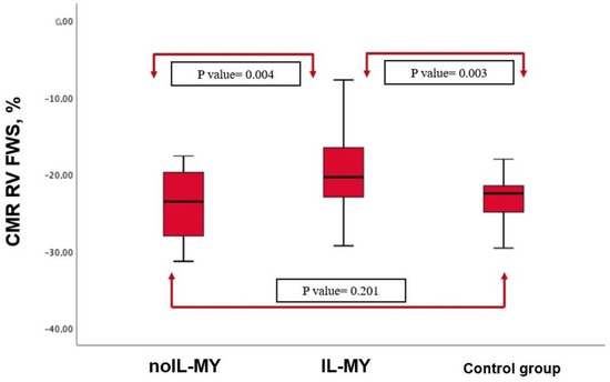 CMR RV-FWS was no different in patients with myocarditis compared to controls (−21.2% [−17.4–−29.3%] vs. −23.2% [−18.2–−27.3%], p = 0.201), while a statistically significant difference was found between RV-FWS in IL-MY and noIL-MY (−18.17% [−11.2–−22.8%] vs. −24.2% [−19.4–−28.7%], p = 0.004). (Figure 1 and Figure 2). Finally, considering a median value of RV FWS −23% in the control group, 32 patients (59.2%) with myocarditis were found to have lower values, with a statistically significant difference among IL-MY and noIL-MY (73% vs. 38%, p = 0.003). (Figure 2).