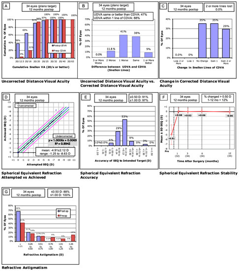 Twelve months after surgery, 91% of eyes were within ±0.50 D of attempted correction, and 97% were within ±1.00 D. Figure 1D shows the scatterplot of the attempted versus achieved correction. Figure 1F shows the difference in SE between the intended and achieved correction as a function of time.