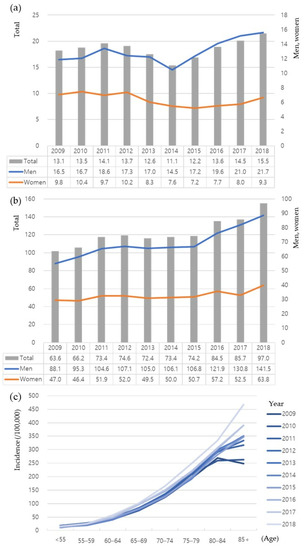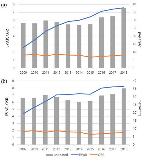 The standardized incidence of AAA also increased both in men and women, from 45.60 per 100,000 in 2008 to 64.46 per 100,000 in 2018 in men and from 22.70 per 100,000 in 2008 to 24.97 per 100,000 in 2018 in women. When compared with the crude incidence, the standardized incidence was slightly lower from 2012 to 2015 than in 2011 in men and from 2012 to 2017 than in 2011 in women. The increases in 2017 and 2018 were most pronounced both in men and women. The gender-specific annual incidence of AAA tended to increase both in patients aged <65 and ≥65 years (Figure 2a,b). In 2018, the incidence of AAA in patients aged ≥65 years was 141.5 per 100,000 in men and 63.8 per 100,000 in women. The increased annual incidence of AAA was more apparent in patients aged ≥65 years than in those aged <65 years and in men than in women. The incidence in women aged <65 years was relatively constant, but slightly increased in women aged ≥65 years. In the later years of our study, the incidence peaked at age 80–84 years, but the incidence of AAA among patients aged 80 and above has shown an upward trend over time, resulting in a diverging incidence curve (Figure 2c). The crude and standardized incidences of untreated AAA were higher than those of treated AAA, with the former showing increasing trends in the three most recent years (Figure 3). The incidence of EVAR steadily increased during the study period, whereas the incidence of OSR remained constant.