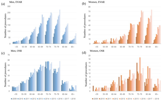 The number of procedures in all age groups increased from 2009 to 2018 (Figure 4). The increases in EVAR were most apparent among men aged 75–79 years and women aged 80–84 years (Figure 4a,b), whereas the numbers of OSR procedures increased in men in almost all age groups (Figure 4c). However, the numbers of OSR procedures in most age groups of women peaked during the middle of the study period and then gradually decreased (Figure 4d). Relative to men, the AAA procedure-age curve in women was shifted to the right by approximately 5 years.