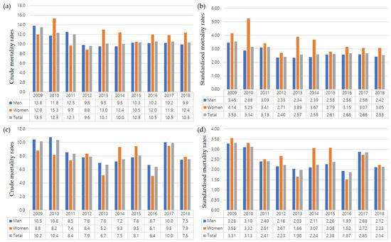 The crude all-cause mortality rate in patients who underwent EVAR decreased from 2009 to 2012, remaining constant thereafter (Figure 5a). The mortality rate for patients who underwent EVAR was higher among women than men during most of the study period (Figure 5a,b). The crude all-cause mortality rate in patients who underwent OSR was lower in 2018 than in 2009 but varied during the interim (Figure 5c). The difference in mortality rate between men and women who underwent OSR was smaller at the end of the study period (Figure 5c,d).