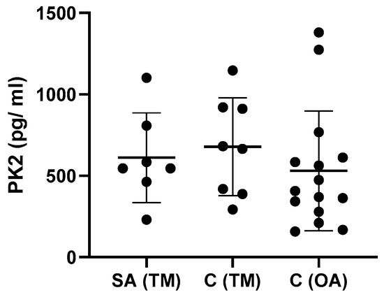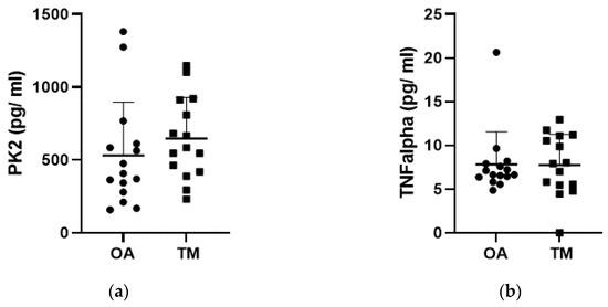 Furthermore, we evaluated a possible difference in PK2 levels between the two groups, degenerative and traumatic. Although we initially assumed that PK2 levels in the TM group would be greater because of the acute nature of this condition, the data do not support this assumption, as PK2 levels did not differ between the OA and TM groups.