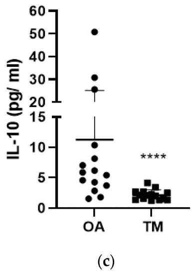 Nonetheless, there is a significant difference between the two groups in IL-10 content; specifically, IL-10 concentrations were greater in the OA group than in the TM group. IL-10 is an anti-inflammatory molecule, antagonistic to pro-inflammatory influences, and consequently is chondroprotective. Increased levels of IL-10 indicate a pronounced anti-inflammatory component in degenerative injuries; by contrast, lower concentrations of IL-10 are reflective of the pro-inflammatory environment following traumatic injuries, which might contribute to post-traumatic OA onset. Support for this hypothesis was recently reported by Barker et al., wherein low serum IL-10 concentrations were found in patients with post-traumatic OA and in patients with severe OA (grade 4 according to Kellgren–Lawrence classification) [31].