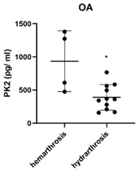We also assessed the effects of sample quality on PK2 levels. In the case of OA patients, PK2 levels were significantly (p < 0.05) greater in hematologic (hemarthrosis) samples compared with clear (hydrarthosis) samples (Figure 3). By comparison, there was no significant influence of sample quality on the levels of the two cytokines (Table 3 and Table 4).