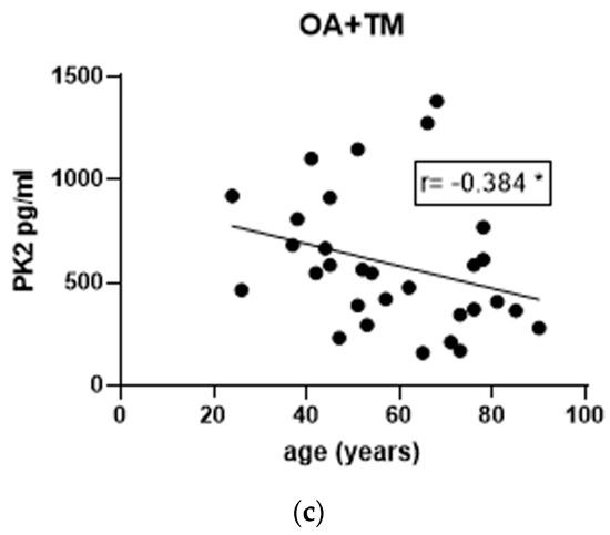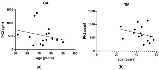 Although the TM group represented only one gender, both genders were represented in the OA group; nonetheless, there was no significant difference in PK2 levels between genders (Table 3 and Table 4). With respect to the influence of age, data pooled together from the OA and TM groups revealed a significant inverse correlation between age and PK2 levels (r = −0.384, p = 0.0361) (Figure 4c). Within each of the two groups, there was no significant correlation between age and PK2 levels; nonetheless, there was an inverse (non-significant) trend of age in the TM group (p = 0.0796). We did not detect any gender (Table 3) or age influence on the levels of the two cytokines.