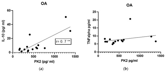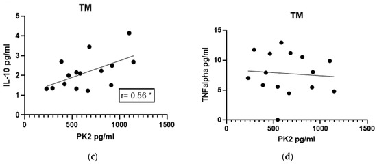 We considered potential coordinate relationships in levels among these molecules in the two patient groups. There was a significant positive correlation between PK2 and IL-10 levels in the OA group (p = 0.0048, r = 0.70, Figure 5a), as well as in the TM group (p = 0.0294, r = 0.56, Figure 5c). There were no correlations between TNF-α and PK2 levels in either group (Figure 5b,d).