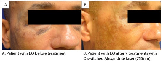 For the majority of patients, the development of EO is distressing as the hyperpigmentation is the exact inverse of the desired effect that initially led to the utilization of HQ-containing OTCs creams. Therefore, many patients seek other treatments to reduce the dyschromia. It has previously been found that six patients, with varying severity of EO, responded well to Q-switched Nd:YAG laser treatments [12]. We demonstrated efficacy with Q-switched Alexandrite laser treatments for EO as highlighted in Figure 1. There is a noticeable reduction in the level of dyschromia following treatment. For patients who struggle with EO, laser-based treatment options should be explored to help lessen the hyperpigmentation and thus the severity of the EO, especially in prominent facial regions. Q-switched Alexandrite laser treatments have been proven to be effective and safe in carefully selected skin of color patients, with no increase in rates of adverse events when utilized properly [13]. Therefore, this modality may be utilized more in EO due to the patient population impacted.