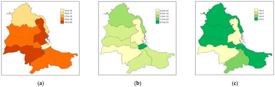 Spatial distribution of caries-free (ICDAS0) (a), extensive lesion (ICDAS5–6) (b), and the Deprivation Index (c) in the eight municipal districts of Palermo. The Deprivation Index ranges between 1 (the least deprived) and 5 (the most deprived).