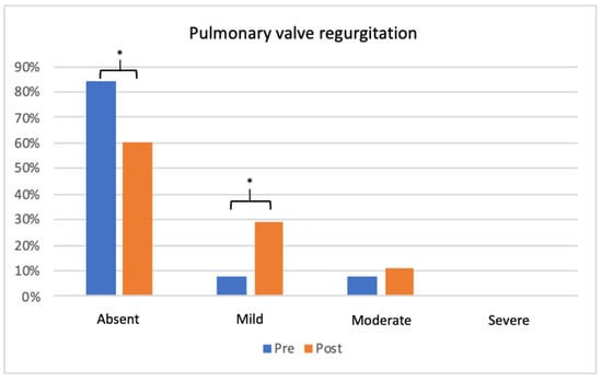 Bar graph showing the evolution of pulmonary valve regurgitation degree after balloon pulmonary valvuloplasty. Mild pulmonary regurgitation increased after the procedure, while there was no statistical increase in moderate or severe valve regurgitation before and after the procedure. * = p < 0.05.