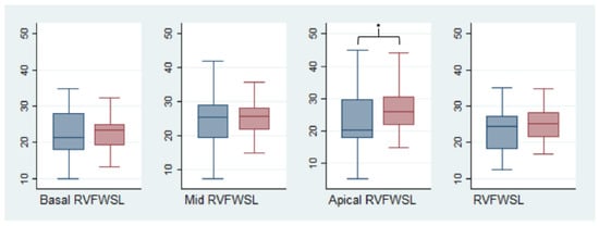 Pre- and post-procedural segmental and global right ventricle longitudinal strains. The blue box represents pre-operative values and the red boxes represent post-operative values. * = p < 0.05. RVFWSL = right ventricular free-wall longitudinal strain.