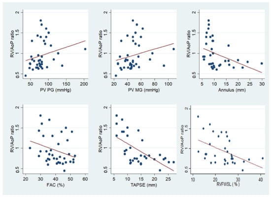 Univariate analysis revealed a negative correlation between the pre-operative RV/AoP ratio and pre-operative 2D TTE estimated PV annulus, and RV systolic function indices (FAC, TAPSE, and RVFW longitudinal strain). Conversely, a positive correlation was found between pulmonary transvalvular gradients (peak and mean) and the pre-operative RV/AoP ratio (Figure 4).