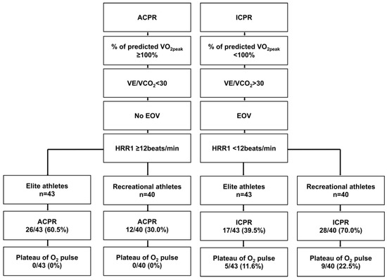 Definition and prevalence of the primary endpoint adequate cardiopulmonary response (ACPR) in elite and recreational athletes. ACPR is defined by the presence of all of the following criteria: (1) ≥100% of predicted peak oxygen consumption (VO2peak), (2) VE/VCO2 < 30, (3) no presence of exercise oscillatory ventilation (EOV), (4) heart rate recovery 1 min after exercise termination (HRR1) ≥ 12 beats/min. ICPR: inadequate cardiopulmonary response, which is defined by the absence of at least one criterion of ACPR. EOV: exercise oscillatory ventilation. HRR1: heart rate recovery one minute following exercise termination. Plateau of O2 pulse was defined as a deflection of the curve from one time point to the next.