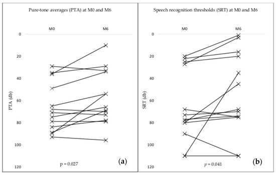Pure-tone averages (PTA) and speech recognition thresholds (SRT) before treatment and at 6 months and statistical significance. (a) PTA (b) SRT.