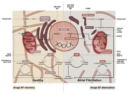 - Pool, L.; Wijdeveld, L.F.J.M.; de Groot, N.M.S.; Brundel, B.J.J.M. The Role of Mitochondrial Dysfunction in Atrial Fibrillation: Translation to Druggable Target and Biomarker Discovery. Int. J. Mol. Sci. 2021, 22, 8463. [Google Scholar] [CrossRef] [PubMed]