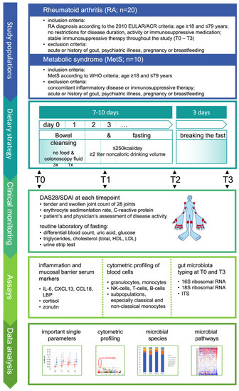 We removed the gut microbiota by flushing out more than 95% of the microbial load with colonoscopy fluid [29], optimized by dose splitting [30], and maintained this microbiota reduction by fasting for at least one week. A significant reduction in clinical disease activity was the primary objective. Extensive profiling of leukocyte subpopulations in the blood, serum markers of inflammation and mucosal permeability were performed to identify the dominant immunological changes. The prokaryotic and eukaryotic gut microbiome was investigated as a first pilot study of microbiota reduction in RA. To distinguish RA-specific from general effects, patients with MetS served as a control (Figure 1). The effect of fasting on RA disease improvement is strong and requires only small group sizes for sufficient power. As expected, the primary objective, a reduction in the disease activity score 28-joint count (DAS28) and a simplified disease activity index for RA (SDAI), was achieved, as almost all RA patients improved rapidly. As the dominant effect, and highly significant only in RA, the initially elevated monocyte turnover decreased. Serum levels of interleukin 6 (IL-6) and zonulin also decreased in RA. Analysis of the RA gut microbiota suggested not only prokaryotic but also eukaryotic dysbiosis. In addition, fasting shifted the microbiota towards bacteria with a broader range of metabolic capabilities in both RA and MetS, suggesting opportunities for inducing beneficial changes by fasting in general. The data support microbial triggers in RA, demand further investigation of the gut microbiota, and encourage targeted and personalized nutritional interventions.