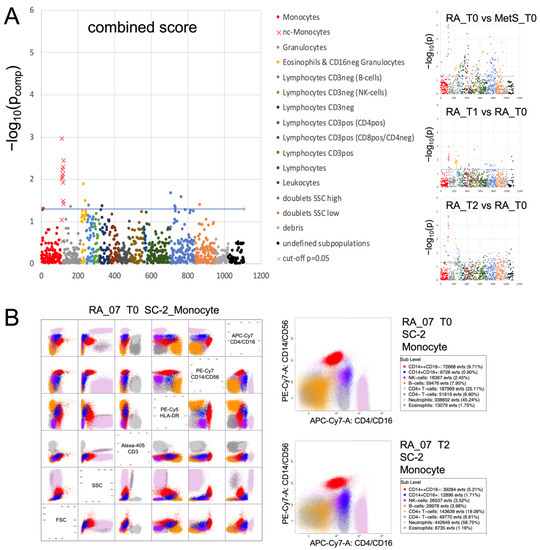 Cytometric profiling summary. FACS analysis of blood leukocytes was performed with 10 different staining cocktails [34] as indicated in the methods section. The immunoClust algorithm [35] identified about 110 different populations per staining cocktail. (A) All populations were compared by one-tailed paired t-test in RA between T0 and T1 or T2 and by Welch test between RA and MetS at T0. Test-results for all different populations (indicated by number on the abscissa) are presented on the ordinate as −log10(p) values with significance above the dashed line (−log10(0.05) ≈ 1.3). Monocytes and their subpopulations were detected in all 10 cocktails, albeit best with cocktails containing CD14 and CD16 staining and with varying degrees of separability in others. In all three group comparisons and also in the different staining cocktails that separated sufficiently the monocyte subgroups, non-classical monocytes revealed the dominant differences. This can be considered as a technical validation. The combined score (weakest p-value from all three comparisons) highlights this dominance when compared to all other populations. Significance refers to a decrease in RA_T0 compared to MetS_T0 and a gradual increase in RA_T1 and RA_T2 compared to RA_T0. (B) Dot plots of leukocyte populations are exemplarily presented for staining cocktail 2 (SC-2) in RA_07 with selected markers to indicate the separation of the relevant populations. Details of population characterization are summarized in Figure S1. The two plots with CD14/CD16 staining present the populations of RA_07 at T0 and T2 with an increase in non-classical monocytes at the end of fasting (blue).