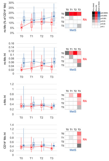 Changes in monocyte populations. Non-classical monocytes (nc-Mo) are decreased at T0 in RA (red) when compared to MetS (blue). They increase after bowel cleansing and during fasting in RA until T2. After fast breaking, monocytes, classical (c-Mo) and nc-Mo, decrease slightly but significantly in RA between T2 and T3. The distribution of values is displayed in boxplots (upper and lower quartile) with whiskers (maximum and minimum) and median. The 4 × 4 panel displays the significance of the corresponding comparisons between the different time points T0 to T3 for RA (red, top right) and for MetS (blue, bottom left), as well as between RA and MetS at the same time points (grey, diagonal). The color intensities corresponding to the significance level are shown in the 3 × 6 panel. Values are calculated in % of all monocytes or cells per nanoliter (nL) of blood.