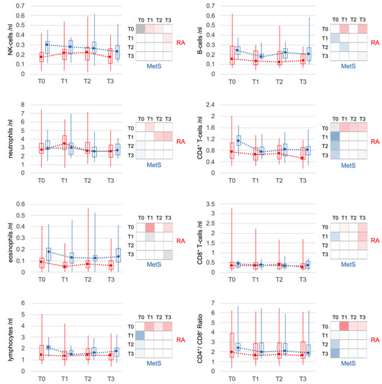 Changes in other major leukocyte populations. Less pronounced but significant changes were also seen for other leukocyte populations. In RA, changes in NK cells were weaker but comparable to those of non-classical monocytes. Lymphocytes as a whole and the subpopulations of T-cells and B-cells showed similar changes in RA and MetS patients. Only neutrophils and eosinophils showed slight differences. Neutrophils increased transiently (T1) only in RA and eosinophils changed, although similar, with significance only in RA. Statistical significances of comparisons were indicated as described in Figure 3.