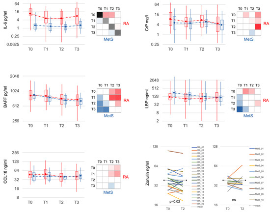 IL-6 demonstrated the most significant difference between RA and MetS at all time points (Figure 5). The elevated levels in RA at baseline decreased within 3 days at T1. B cell activating factor (BAFF) dropped significantly in both groups with comparable mean values but greater variation in RA. CC-chemokine ligand 18 (CCL18), a cytokine of innate immune cells, diminished from initially slightly higher values in RA to levels comparable to MetS at T2. CrP, also moderately elevated in RA at baseline, decreased significantly at T1, but rebounded towards the end of the fast. Lipopolysaccharide binding protein (LBP), another acute phase protein, was slightly lower in RA compared to MetS at T0 and decreased in both groups during fasting. Zonulin, a marker of mucosal permeability, was more frequently elevated in RA at T0 (>38 ng/mL: RA n = 9; MetS n = 3) and significantly declined only in RA (meanT0 = 41.6 ng/mL; meanT2 = 38.6 ng/mL; p < 0.05) but not MetS (meanT0 = 36.2 ng/mL; meanT2 = 38.0 ng/mL).