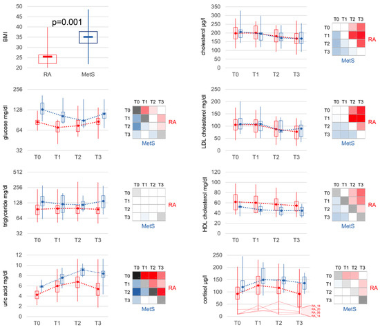 Metabolic markers. Besides a significant difference in BMI, metabolic markers at baseline showed significantly increased levels of glucose, triglycerides, uric acid, HDL-cholesterol and also cortisol in MetS patients. Bowel cleansing and fasting led to comparable changes in RA and MetS. Interestingly, the difference for HDL-cholesterol remained significant between RA and MetS at all time points. Cortisol increased in both groups, was lower in RA than in MetS at all time points and only showed a slightly more significant increase in the early phase (T1), which can be explained by the very low levels in some patients with apparent partial adrenocortical insufficiency. Statistical significances of comparisons were indicated as described in Figure 3. BMI: body mass index; LDL: low-density lipoprotein; HDL: high-density lipoprotein.