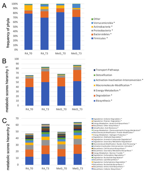 Frequencies of gut microbiome phyla and metabolic scores. (A) This graph summarizes the mean abundances of phyla before (T0) and after fasting (T3) in RA and MetS patients. For Firmicutes, Bacteriodes, Proteobacteria, Actinobacteria and Verrucomicrobia (Akkermansia muciniphila), the changes are similar in RA and MetS patients. (B,C) Metabolic activities were scored based on annotations in the MACADAM database by multiplying the abundance of each species in each sample with each associated metabolic score in the MACADAM database. Scores were summed separately for each pathway in each sample and then for each higher-level annotation hierarchy. Mean scores for annotation hierarchy 1 (B) and 2 (C) were calculated and presented for RA and MetS before and after fasting. They show a mean increase for (B) biosynthesis, degradation, and energy metabolism and in detail (C) the increase in synthesis of co-factors, amino acids, nucleotides, and lipids but also degradation of carbohydrates in the same way in RA and MetS after fasting. * p < 0.05 for comparisons between T0 and T3.
