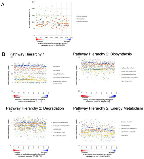 Fasting resulted in much more pronounced differences. In RA patients, Actinobacteria and Firmicutes decreased significantly, while Bacteroidetes and Verrucomicrobia (Akkermansia muciniphila) increased (Figure 7A, Table S2C,D). Further taxonomic sorting down to the species level displayed individual changes rather than general effects of fasting. Assuming that differences in metabolic capabilities between higher order of grouping than species contribute to this observation, we calculated virtual metabolic scores for each sample based on species abundance and species-specific annotation of pathway scores in the MACADAM database [40]. This approach suggests that metabolic capabilities increase after fasting, particularly in the areas of biosynthesis, degradation, and energy metabolism (Figure 7B,C, Table S4). The calculated metabolic switch matched the observed changes in microbial abundances at phylum level: the species of the phylum Bacteroidetes, that increased after fasting, were annotated with higher pathway scores, as were many of the proteobacteria that also increased. In contrast, the significantly reduced Firmicutes species were assigned fewer metabolic capabilities (Figure 8). Thus, after fasting, a shift towards a category of species with a broader metabolic repertoire relevant to microbiota expansion was observed (Table S5A,B).