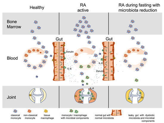 Against this background, intestinal cleansing and fasting to reduce the largest microbial colonization of the body gains particular importance. Our results, indicating that virtually all RA patients experienced clinical improvement and an increase in the non-classical monocyte population within a few days, together with a decrease in serum inflammatory markers, can be taken as an indirect sign that disease activity in RA is maintained by components of the intestinal microbiota (Figure 9).