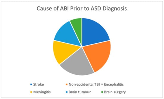 The mean age (Mage) at which the ABI was sustained for the cohort of 14 children with comorbid ASD was 18.66 months (or approximately 1.55 years, range: birth–118 months). Across all cases, the ABI occurred before an ASD diagnosis was given and symptoms occurred after and not prior to ABI. Figure 1 shows the nature of the ABI prior to a secondary diagnosis of ASD. Non-accidental TBI occurred in 21.4% of children while the remaining children had non-TBI related injuries (78.6%). Of the non-TBI related injuries, 21.4% were due to stroke, 21.4% were due to encephalitis, 14.3% were due to meningitis, and 14.3% were due to a brain tumour. One child had damage that occurred during brain surgery (7%).