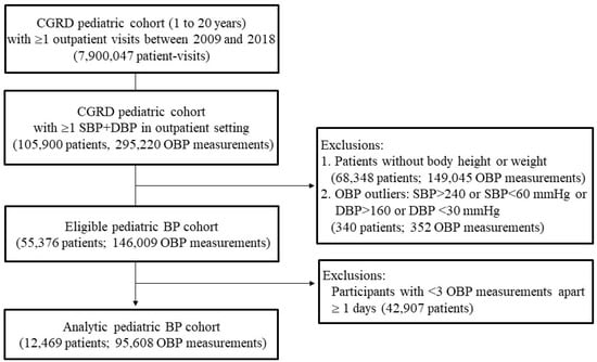 This was a retrospective cross-sectional study in which the participants underwent multiple OBP measurements from 2009 to 2018. The participants included children and adolescents who received outpatient care from pediatric specialists at the CGMHs. Available patient-level EHR data were retrieved from the CGRD, which covered medical encounters, diagnosis, prescription and dispensing, procedures, and laboratory results [14,15]. Among the 7,900,047 patient visits from 1 January 2009 to 31 December 2018, we identified 105,900 participants aged 1–20 years who had at least one measurement of both systolic BP (SBP) and diastolic BP (DBP) at the same outpatient visit.