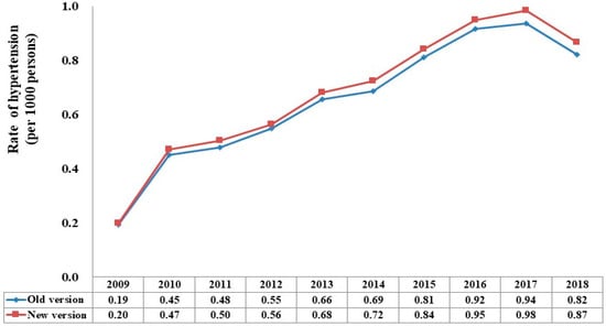 Annual rate of pediatric hypertension among children and adolescents in the CGRD from 2009 to 2018. CGRD, Chang Gung Research Database; Old version: 2004 Fourth Report; New version: 2017 AAP guidelines.