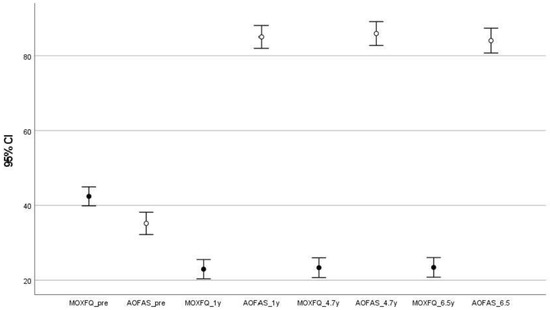 Table 7 summarizes and compares the pre- and postoperative AOFAS and MOXFQ scores. The AOFAS score increased by nearly 50 points from the preoperative level at all postoperative time points (