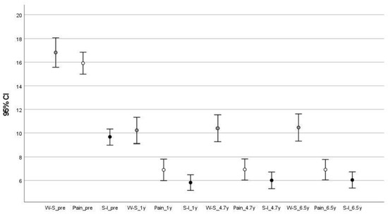 p < 0.001), whereas the postoperative W-S scores differed by 0.2 points or less (not significant). Likewise, the difference between the preoperative Pain score and all postoperative Pain scores was 6 points (