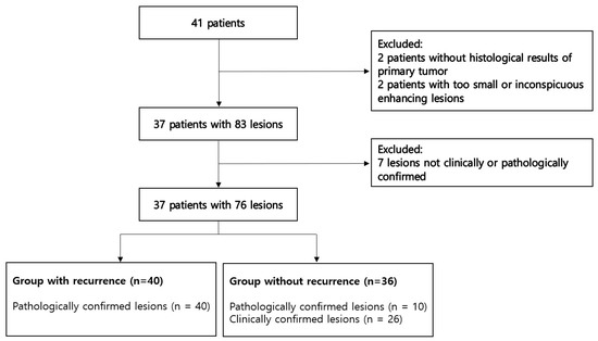 To divide patients into the two study groups (with and without recurrence), we reviewed medical records including operation records, pathology reports, and multidisciplinary case conference records. Postoperative MR images after tumor excision and reconstructive surgery were also reviewed. Postoperative MRI findings refer to follow-up MRI scans taken on a set schedule after reconstructive surgery, usually every 3–6 months during the first 1–2 years, depending on the histologic type and grade. We selected patients and lesions using the following inclusion and exclusion criteria. Inclusion criteria were: ① adult (≥17 years) patients who had undergone malignant soft tissue tumor resection followed by soft tissue reconstruction between 1 January 2010 to 31 October 2021 in our institution; ② focal enhancing lesion in any location of the scanned surgical site in postoperative MRI; and ③ lesion met either (a) or (b)–(a) pathologically confirmed lesion using excisional or incisional biopsy or image-guided core needle biopsy, (b) clinically confirmed benign lesion defined as a lesion with a >30% decrease in longest axis measurement during follow-up MRI after at least 1 year without adjuvant chemotherapy or radiation therapy. Exclusion criteria were: ① patients without histological results regarding resected malignant soft tissue tumor; ② too small (<1 cm) or inconspicuous enhancing lesions in postoperative MRI that were defined as not clearly visible due to the weak degree of contrast enhancement and thus not described in the MRI report; ③ subtle linear enhancing lesions along the surgical scar presumed to be postoperative changes, observed clinically or radiologically; and ④ pathologically unidentified lesion that had undergone adjuvant chemotherapy or radiation therapy. When the patient underwent several MRI exams without additional operation, only the exam on which the lesion(s) were seen foremost was selected. Follow-up MRI after additional reconstructed surgery was separately included. For example, one patient underwent MRI 3, 6, 9, 12, and 18 months after reconstructive surgery. This patient underwent re-operation at 13 months to resect a recurrent tumor and also underwent a new reconstructive operation. In this case, the study included one 12th month MRI with the most distinct lesions among the 3rd month, 6th month, and 12th month MRIs. In the case of the 18th month MRI, an 18th month MRI is also included in this study, considering that it is a new case because a new reconstructive operation was performed. Selecting MRI in this way involves newly detected or enlarged lesions during follow-up in an actual clinical setting. When there were multiple enhancing lesions in one MRI, the lesions were separately included as recurrence or postoperative changes according to each pathology result. Included enhancing lesions were classified as a recurrent tumor or benign postoperative change such as inflammation or fibrosis. Finally, 40 local recurrences and 36 postoperative changes were included based on the inclusion and exclusion criteria (Figure 1).