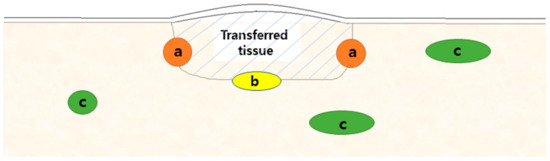 Schematic drawing of enhancing lesions on transplanted tissue: (a) peripheral margin, (b) deep margin, and (c) regional location.